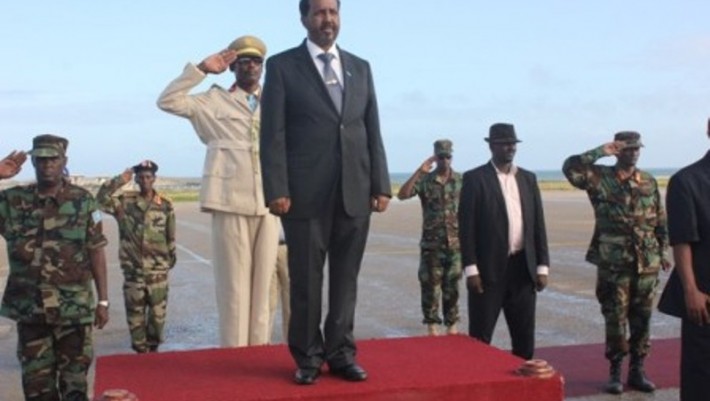 Madaxweyne Xasan Sheekh Maxamuud oo waaberigii saakay ka ambabaxay Magaalada Muqdisho ayaa waxaa garoonka diyaaradaha Aadan Cadde ku sii sagootiyay mas’uuliyiin ka tirsan Labada gole iyo saraakiil ciidan.