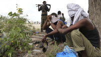 A Somali government soldier stands guard near blind-folded suspects detained during a security operation in Hodan district of the capital Mogadishu