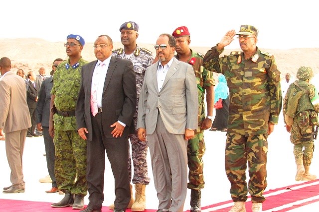 Madaxweynaha Puntland Cabdiweli Maxamed Cali Gaas iyo ku xigeenkiisa C/xakiin Xaaji Cumar Camey ayaa madaxweynaha Somalia kusoo dhaweeyay garoonka Boosaaso, iyadoo ammaanka ay si wadajir ah u sugayeen laamaha kala duwan ee ciidamada Puntland.