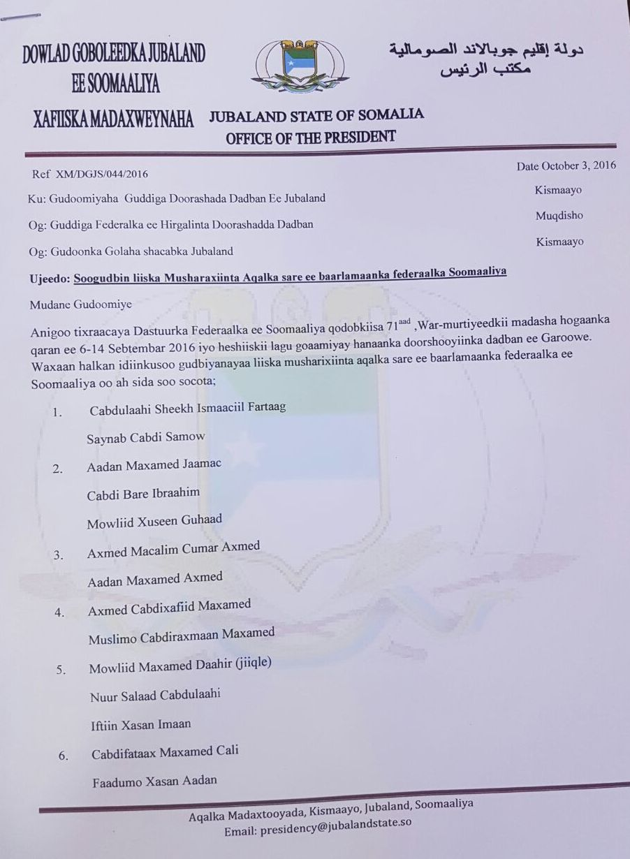 Jubaland oo soo bandhigtey xubnaha ku tartamaya Aqalka sare iyo tirada ay ka koobanyihiin.