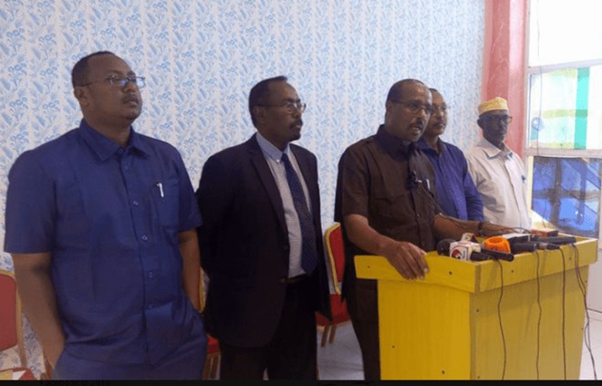Guddoomiyaha guddigaan ahna,Wasiirka Amniga dowladda Puntland,Axmed Cabdullaahi Yuusuf(Dowlad) oo ay garab taagan yihiin xubnaha kale ee guddiga ayaa saxaafadda u akhriyay go’aannadan.