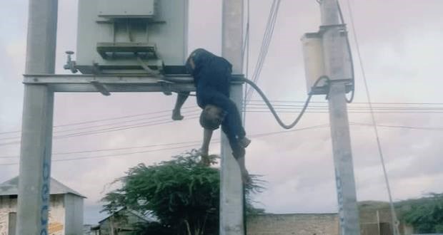 Dadka ayaa saakay ku waabariistay meydka ninka dhalinyarada oo ka soo raaraca mid ka mid ah balayaasha gudbiya kaawada ama fiilada korontada, lamana oga sababta uu markii hore halkaa u fuulay.