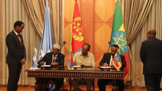 Heshiiskan waxaa qalinka ku duugay Madaxweynaha Soomaaliya Maxamed Cabdullaahi Farmaajo, Ra’iisul wasaaraha Itoobiya Abiy Axmed iyo madaxweynaha Eritrea Isaias Afwerki.