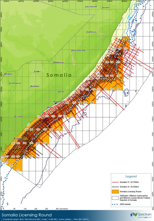 Marka la diyaariyo wareegga ruqsadaha dibadda, Spectrum wuxuu soo gabagabeynayaa soo iibinta iyo shaqeynta 20,185 km oo ah 2D mudada dheer ee xogta seismic, ka dib heshiis wadashaqeyn la leh Dowladda Federaalka Soomaaliya. Barnaamijkani wuxuu dhammeystiray 20,500 Km oo ka mid ah xogta seismic ee hadda la helay sannadkii 2014.