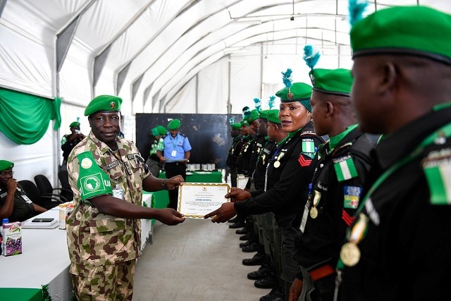 Waxaa lagggudoonsiiyay shahaadooyin iyo abaalmarino oo ay ku mutaysteen shaqo waanaag,waxaana goob joog ahaa Maj. Gen. Fidza Dludlu oo ah madaxa qeybta taageerada howlgalka AMISOM, Rex Dundun taliyaha ciidanka booliska AMISOM,kuwaasi oo ku tilmaamay saraakiisha ka socotay Nigeria in ay muujiyeen dowr muuqda oo ku aadan in ay yihiin safiiro dhab ah oo matala Nigeria iyo Midowga afrika,kadib markii booliska Soomaaliyeed ay ka caawiyeen khibrado badan oo xagga gudashada waajibaadkooda la xiriira.