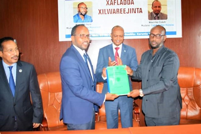 Ra’iisal Wasaare ku xigeenka Xukuumadda Soomaaliya Mahdi Maxamed Guuleed (Khadar) oo xilka u kala wareejiyey Wasiirkii hore & Wasiirka Cusub ayaa Amaanay Shaqadii uusooqabtay Wasiirkii hore, Wasiirka Cusub ee Wasaaradda ayuu kula dardaarmay inuu layimaado dar dar gelinta howlaha shaqo ee Wasaaradda.