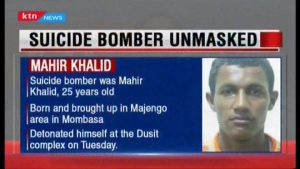 Ninka isku qarxiyay dhismaha DusitD2   ee Mahir Khalid oo 25 jir ah  , ayaa ku dhashay kuna soo barbaaray magaalada Mombasa,waxana uu ka soo laabtay dalka Soomaaliya 13kii bishan kaddib markii uu tababbar muddo sannad ah soo qaatay,sida ay Booliska Kenya sheegayaan.