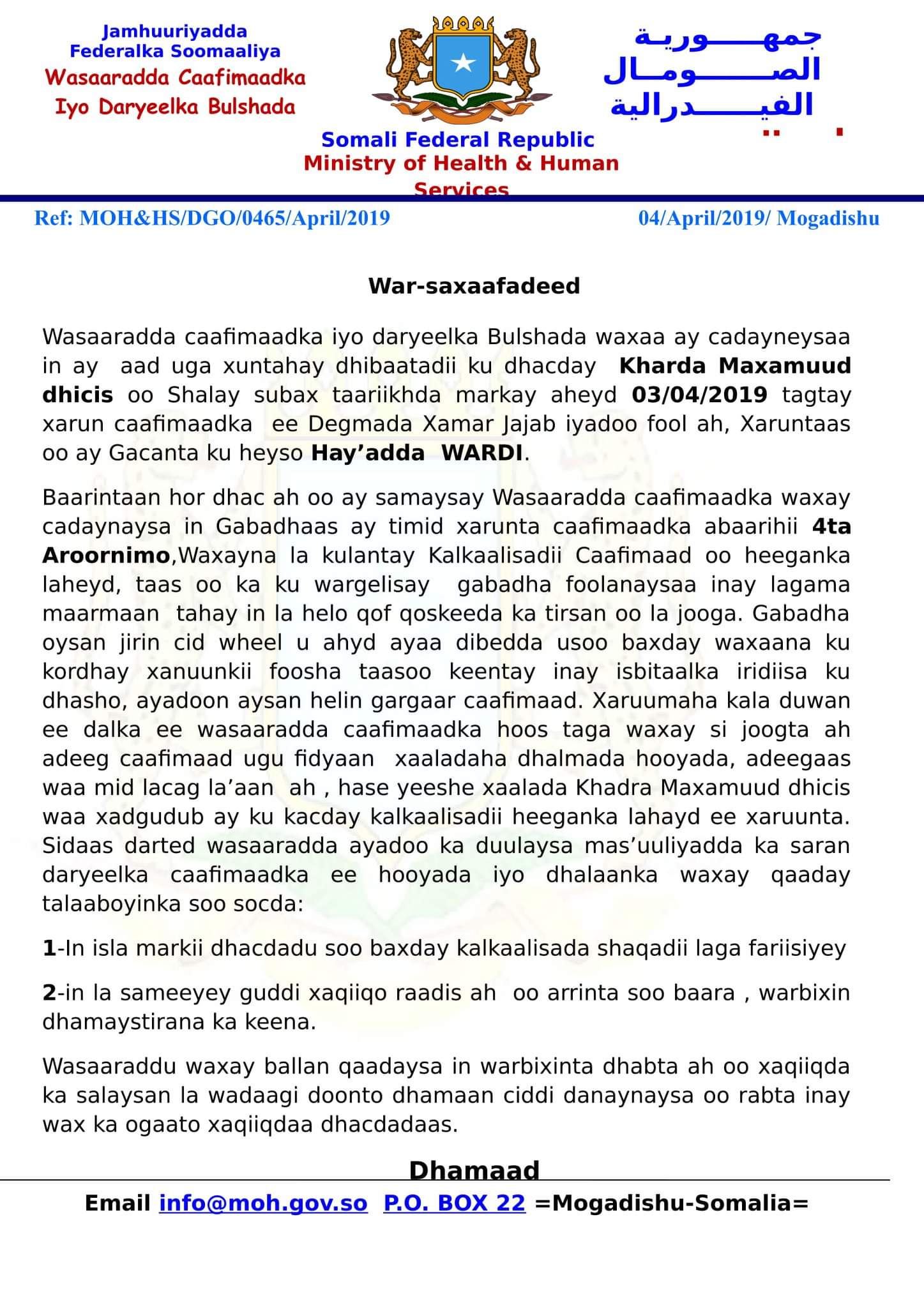 Wararkafacebook.comWararka Caalamka Wasaaradda Caafimaadka Oo War Ka Soo Saartay Dhacdadii Shalay Ka Dhacday Isbitaalka Wardi By Warsom - April 4, 2019 0 543 Facebook Twitter WhatsApp Linkedin Wasaaradda Caafimaadka Somaliya ayaa sheegtay inay aad uga xun tahay falkii shalay Isbitaalka Wardi oo ku yaalla Degmada Xamar Jajab uu ku hor istaagay inay isbitaalka ku dhasho Hooyo Fool heysay. Wasaaradda ayaa sheegtay in shaqada laga fariisiyay Gabadhii heeganka laheyd habeenkaas ee Hooyo Khadro Maxamuud u diiday inay Isbitaalka ku dhasho. Wasaaradda Caafimaadka ayaa sheegtay guddi xaqiiqo raadin in ay u saartay dhacdadan, islamarkaana bulshada lala wadaagi doono wixii ka soo baxa.
