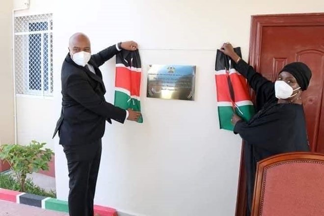 Wasiirka arrimaha dibadda ee Kenya Raychelle Omamo oo uu weheliyo dhiggeeda  Soomaaliya Maxamed Cabdirisaaq Maxamuud ayaa maanta dib u furtay safaaradda Kenya ee Muqdisho ka dib markii la xiray siddeed bilood ka hor sababo la xiriira xiriirka diblomaasiyadeed oo xumaaday.