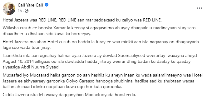 Waxa uu qoraal uu soo saaray ku sheegay in Hotelkaas uu yahay kii madaxda hadda joogta ay ka soo qaadi jireen weerarada siyaasadeed xilligana aysan ahayn in lagu fududaado in la weeraro.