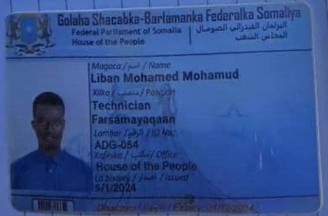 The card found was written by a person named Liban Mohamed Mohamud, whose job was a technician in the Somali Parliament.