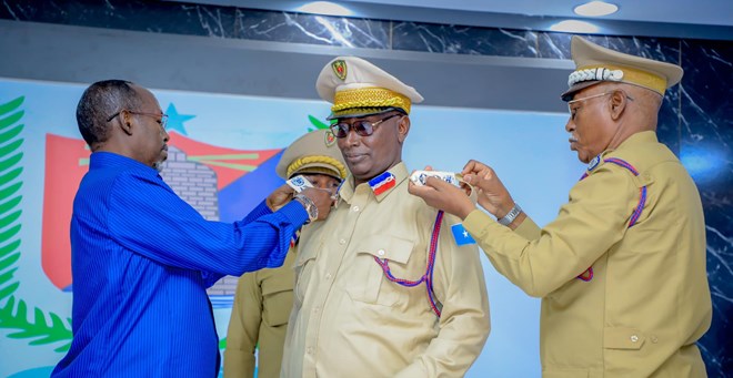 The Commander of Hamar Area Protection Force, General Mohammed Ali Arabow, thanked the President and the Governor of Banadir Region for the promotion of the officers who were promoted today and who play an important role in the leadership of the command.