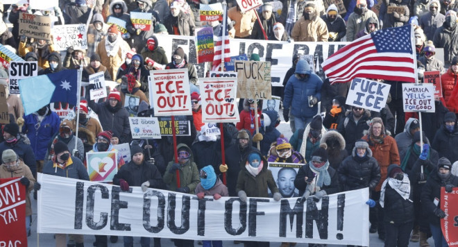 Tobannaan kun oo qof ayaa ku socday bartamaha Minneapolis iyagoo ku jira qabow ka hooseeya eber, si ay uga mudaaharaadaan joogitaanka ballaaran ee wakiillada ICE toddobaadyadii la soo dhaafay.