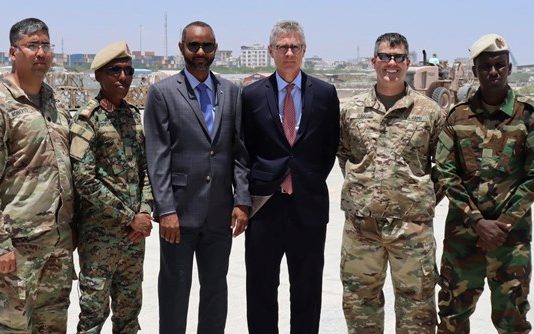Wasiirka Wasaaradda Gaashaandhiga Xukuumadda Fedaraalka Soomaaliya Cabdulqaadir Maxamed Nuur oo uu wehlinaayay Taliyaha ciidanka xoogga dalka Soomaaliyeed Jenaraal Odawaa Yuusuf Raage ayaa Maanta dowladda Mareykanka kala wareegay hub iyo saanad ciidan.