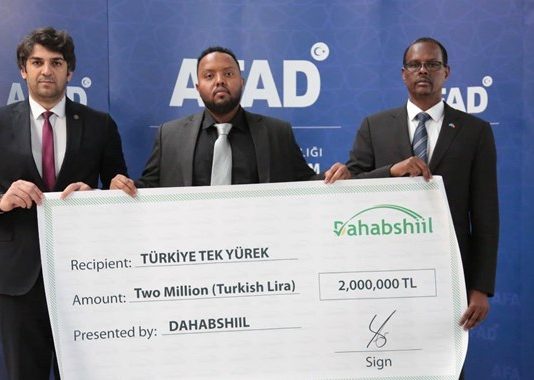 Shirkada Dahabshiil ayaa dadkii dhibaatadu ka soo gaartay dhul gariirka ku dhuftay Turkiga iyo qeybo kamid ah Siiriya ugu deeqday lacag dhan laba milyan oo Lira ah oo u dhiganta in ka badan boqol iyo lix kun oo dollarka.