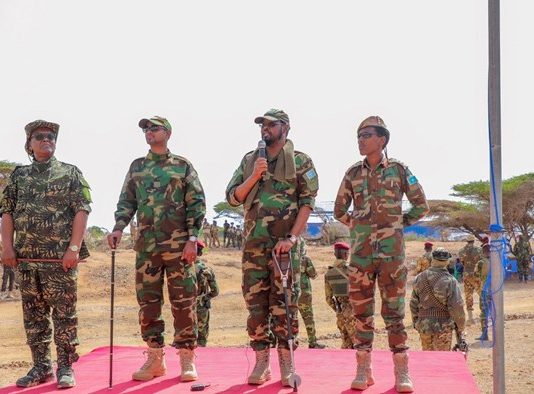 Madaxweynaha Jubbaland, Wasiirka Difaaca Soomaaliya, iyo taliyaha ciidamada xoogga Sareeye Guuto Odowaa Yusuf Raage, ayaa maanta magaalada Kismaayo uga qeyb galay dhoolotuska ciidamo huwan ah oo loo diyaariyay inay qaadaan howlgal Alshabaab looga xoreynayo deegaannada Jubbaland.